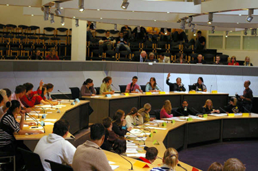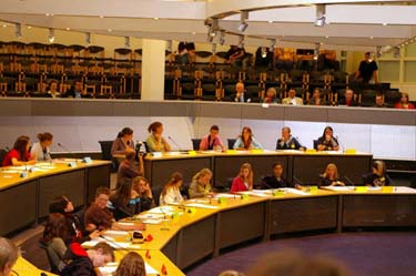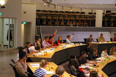 Leerlingen van het Groenhorst College kwamen dinsdagmiddag 15 mei naar de raadzaal en speelden een raadsvergadering na. Van te voren bedachten 5 teams een fictief project van € 5000,00. Zij werden in het besluitvormingproces bijgestaan door raadsleden, die als klankbord voor het team dienden.